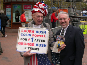 Although the major news organizations we afraid to “make the call” to early on election night, AFMA Exit Poll team had their fingers on the pulse of the American electorate. Shown here in Boston’s Copley Square, the AFMA team of Mike Ruberry and Paul Graller, were unafraid to declare victory for President Bush and even to project the winners of the 2008 election. Even with the preponderance of Kerry supporters and the “Victory Stage” being constructed behind him, Mr. Ruberry displays the official AFMA election projections that will be presented at a later date to the US Senate Sub-Committee on Election Results. Unfortunately, much like the presidential election, Mr. Ruberry is only allowed out every four years.