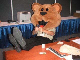 Waterloo, Ontario - Research in Motion, makers of the ubiquitous handheld devices, announced today, a joint venture with the new products division of the American Floor managers Association. RIM will deploy the device to qualified floor managers over the next six months, but began testing the device at the recently concluded FNCE. "We appreciate RIM's recognition of the needs of today's floor manager in the performance of his floor management duties", described Mike Weil, Research Chair of the New products Division. "It has been an unbearable task to continually find our way back to the show office to check for emails from other clients. Now, we can settle in amongst a bunch of crates and no one knows the difference." The new device, set to deliver to retail stores by the 2006 holiday season will be named the BlackBeary. Shown here, Mr. Weil demonstrates the ease of use. "It's a little tough to use the keyboard, but its nice to finally have a product targeted towards our kind", he added.